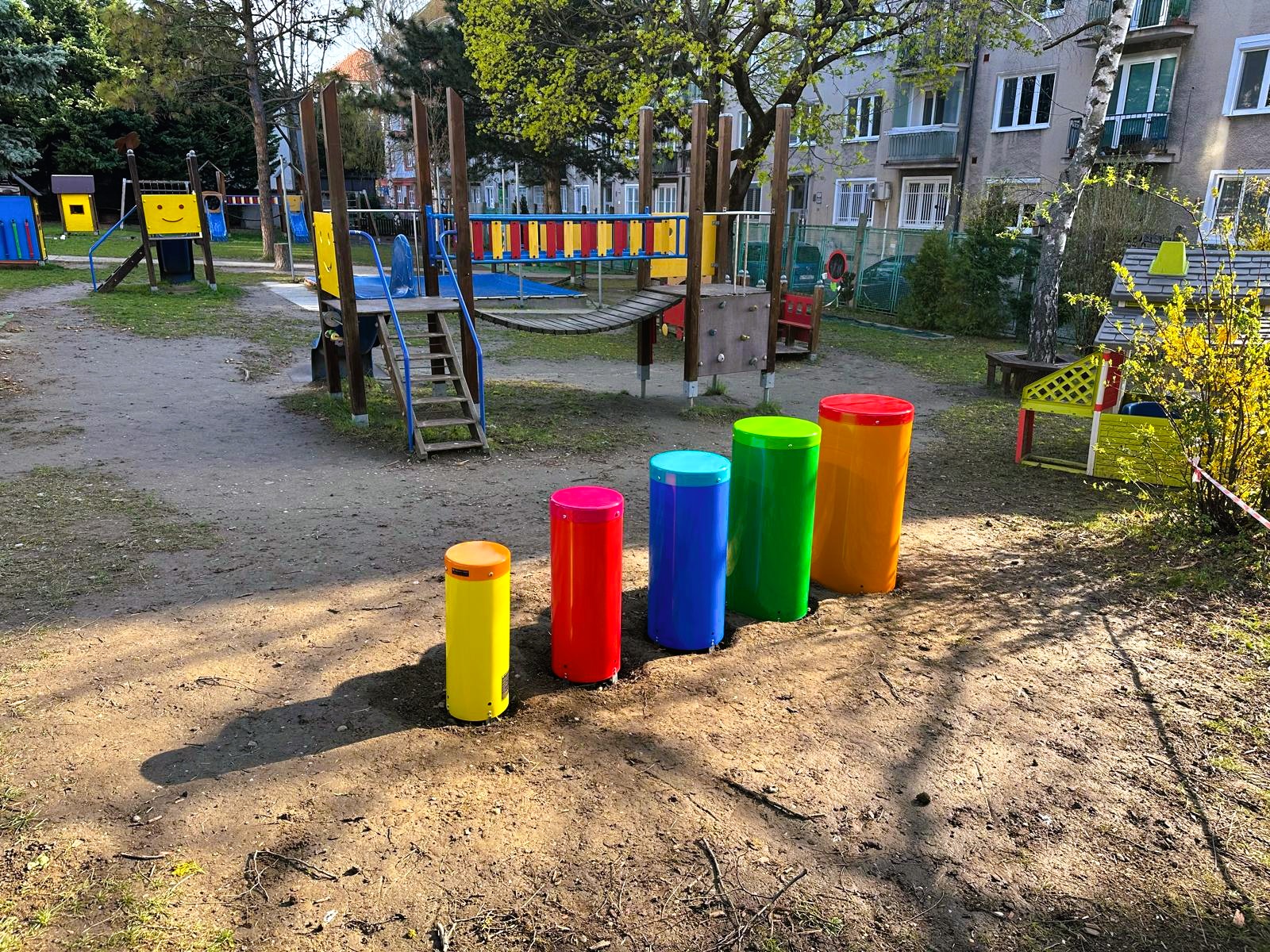 V areáli Materskej školy Pionierska v Bratislave (Nové Mesto) sme zrealizovali montáž dvoch farebných vonkajších hudobných prvkov Melody Park, ktoré vhodne doplnili existujúce detské ihrisko a priniesli doň nový rozmer hry.