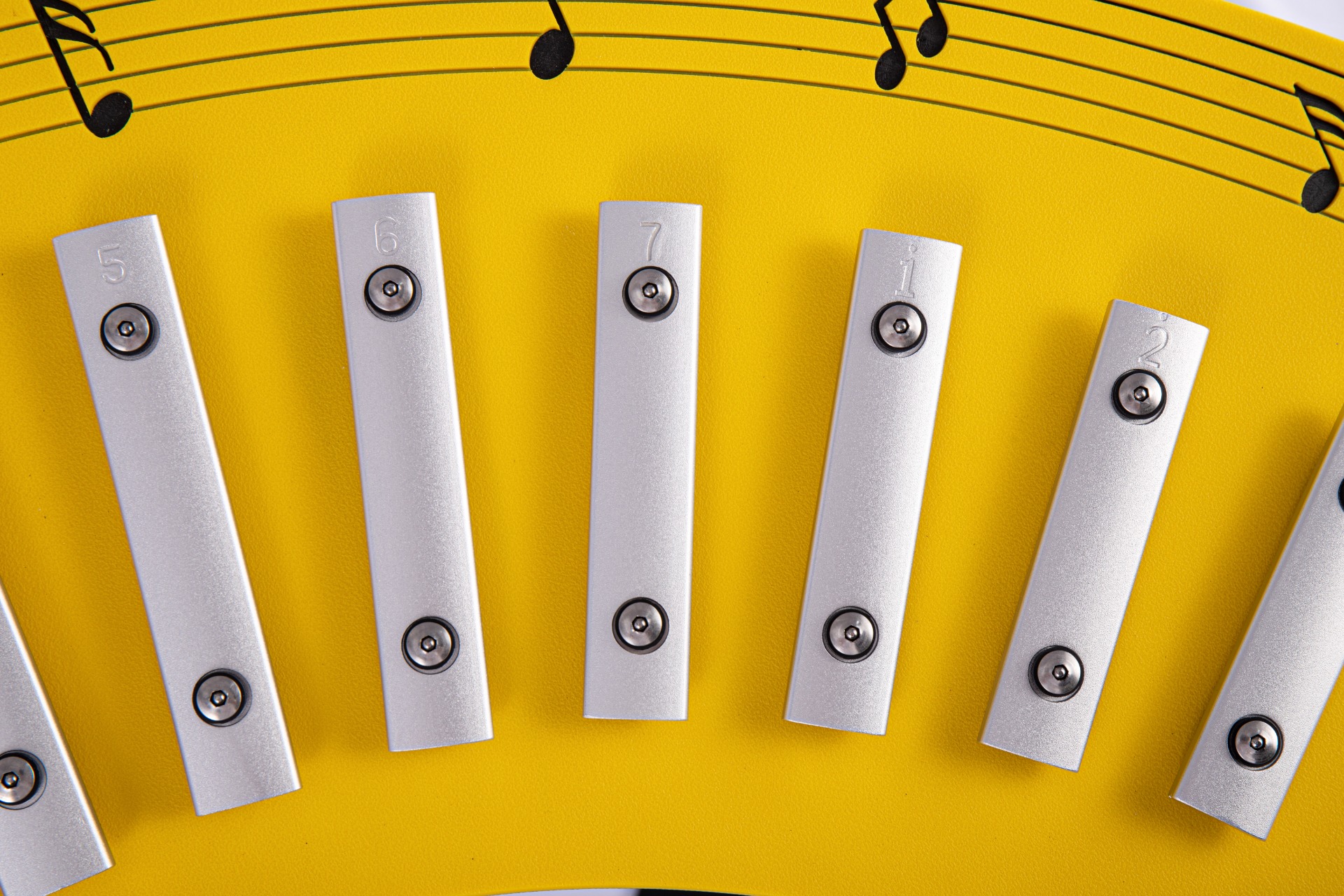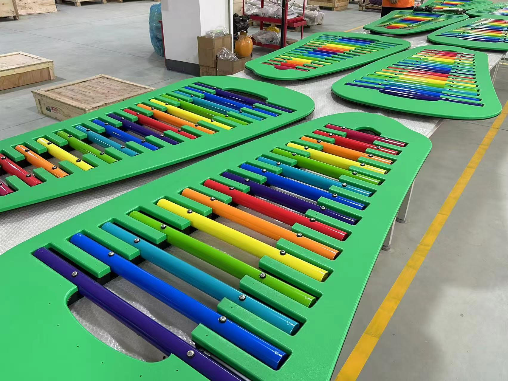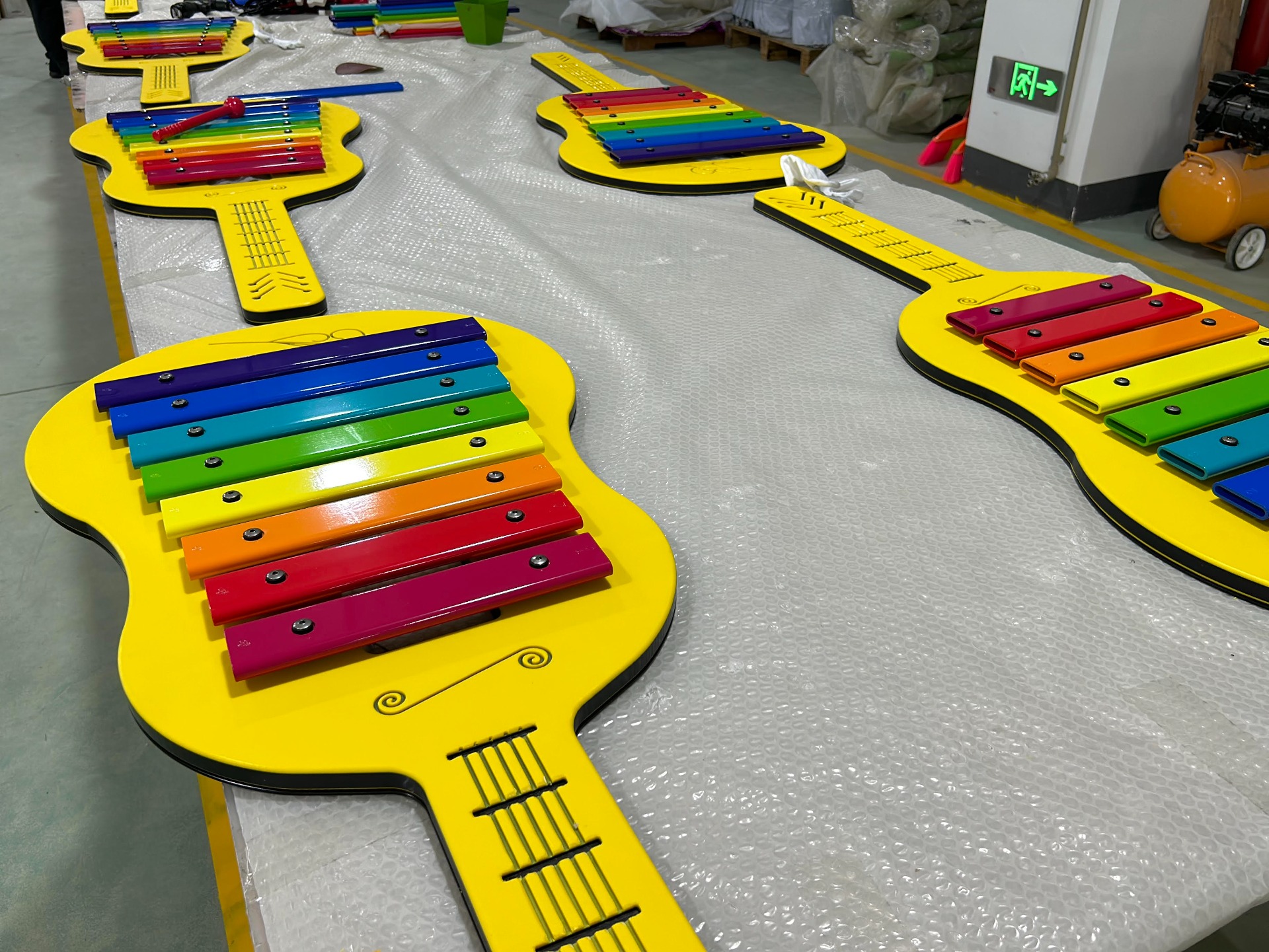 INFO: Všetky naše prvky slúžia výhradne na hudobnú interakciu – deti (aj dospelí) na ne hrajú pomocou gumených paličiek alebo rúk. Nie sú určené na lezenie, balansovanie, šmýkanie, hojdanie, skákanie ani inú pohybovú aktivitu. Nenachádzajú sa na nich plochy určené na sedenie, státie ani pohyb po výške. Používanie prebieha v stoji na bežnej zemi, bez možnosti pádu z výšky.